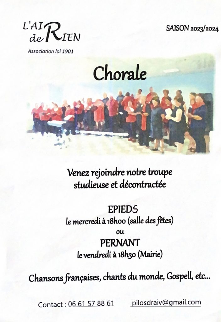 Chansons françaises, chants du monde, Gospell, la chorale « L’air de Rien » se réunit à EPIEDS chaque mercredi à 18 heures, dans la salle communale.